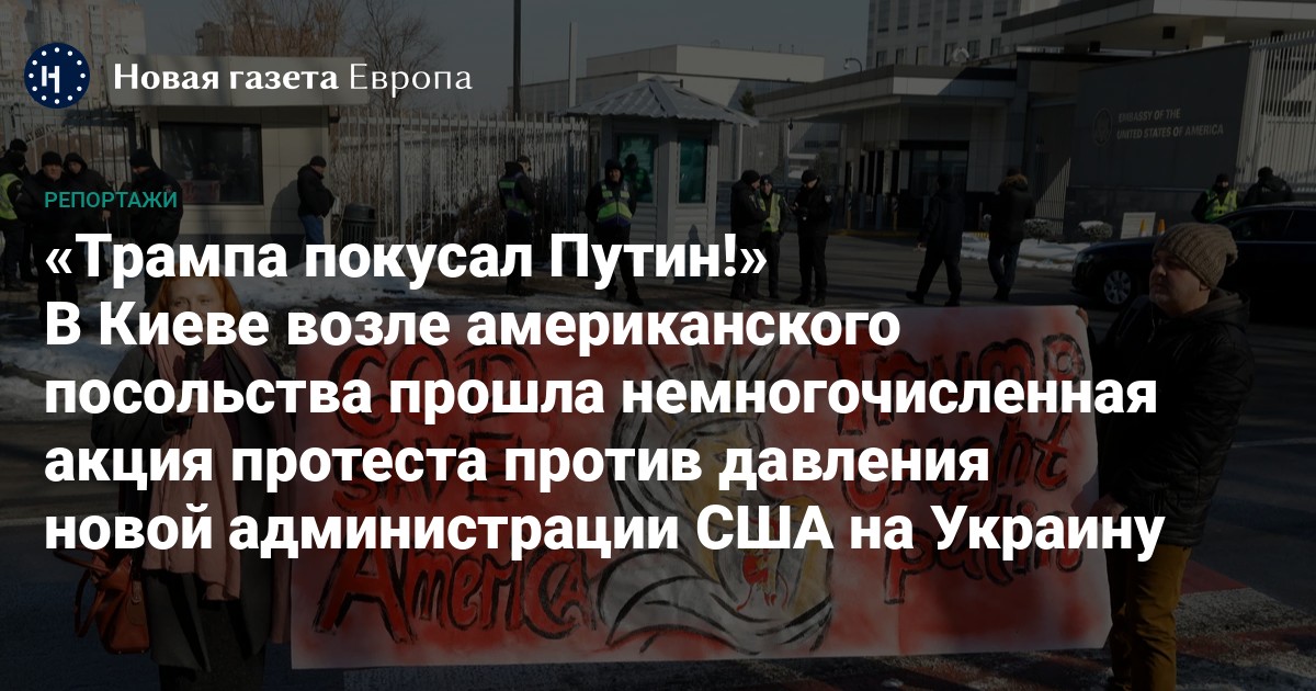 В начале двенадцатого оказалось: акция уже началась. Но не прямо под оградой посольства, как ожидали журналисты, а на противоположной стороне улицы, на опушке парка. Колонна медийщиков двинулась туда и окружила нескольких участников, что встали вокруг красочного транспаранта «God, save America. Trump саught putin» («Боже, спаси Америку. Трамп поймал Путина»). Карикатура в центре полотнища — стилизованная Статуя Свободы, что обнимала президента Трампа и карабкающегося по нему Путина с хвостом (то ли черт, то ли мартышка), — не оставляла пространства для других толкований: политика новой администрации США выглядит чертовски пророссийской. У Трампа тоже виднелся хвост. Похоже, его пририсовали в последний момент.