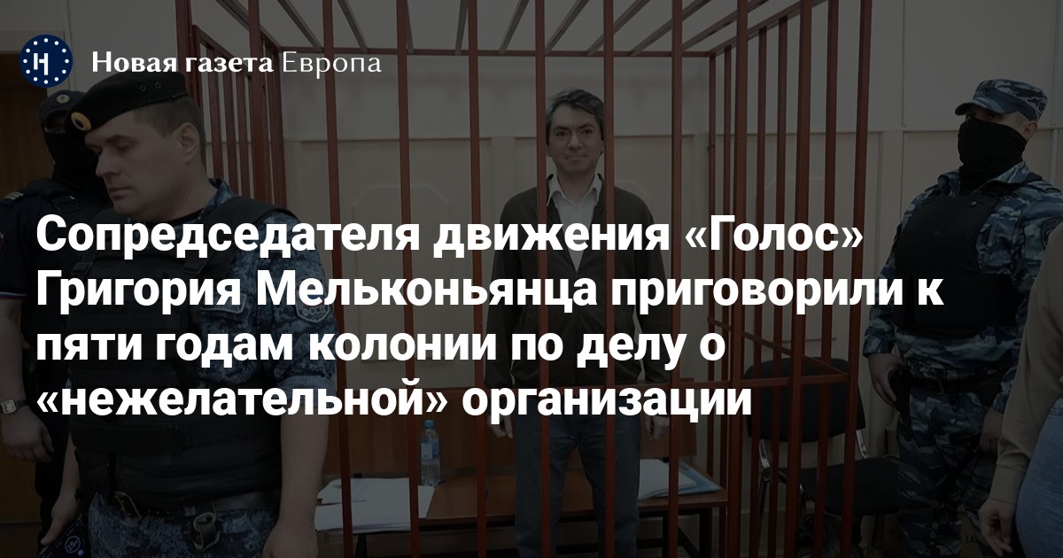 Басманный суд Москвы приговорил сопредседателя движения «Голос» Григория Мельконьянца к пяти годам колонии общего режима по делу об организации работы «нежелательной» неправительственной организации (ч. 3 ст. 284.1 УК). Об этом сообщает «Медиазона».