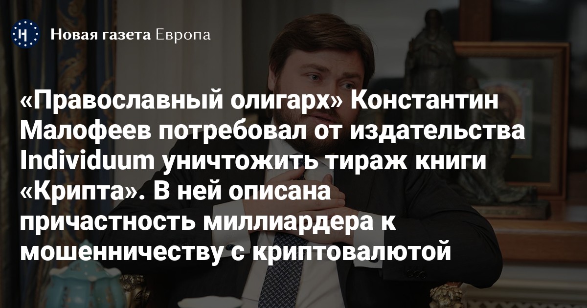 В Москве с издательством Individuum с лета прошлого года судится основатель телеканала «Царьград» и православный миллиардер Константин Малофеев. Олигарх потребовал изъять и уничтожить тираж книги «Крипта. Как шифропанки, программисты и жулики сковали Россию блокчейном» журналиста Андрея Захарова. Об этом пишет Русская служба «Би-би-си».