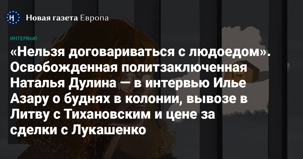 Специальный корреспондент «Новой газеты Европа» Илья Азар поговорил c Дулиной и узнал, почему она расстроилась из-за освобождения, какие книги запрещали в колонии, нужно ли снимать санкции с режима Лукашенко в обмен на политзаключенных и в каком состоянии сейчас находится Мария Колесникова, с которой они виделись в колонии почти каждый день.