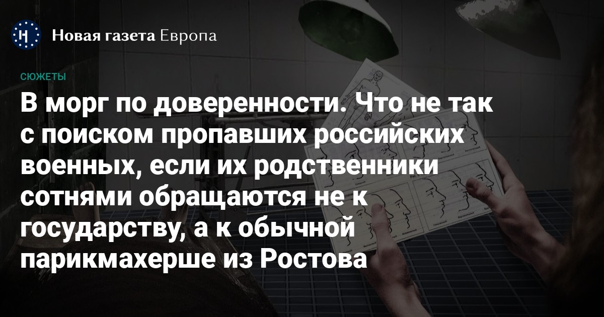 Десятки тысяч семей в России ищут родных, пропавших на войне в Украине: мониторят чаты с фотографиями убитых и пленных, пишут обращения в Минобороны и Путину, годами ждут совпадения по ДНК и лично приезжают в печально известный на всю страну морг в Ростове-на-Дону в надежде найти тело военного. Ситуация сложнее, если посещать ростовский морг возможности нет: маленький ребенок на руках, инвалидность, нет денег на дорогу.