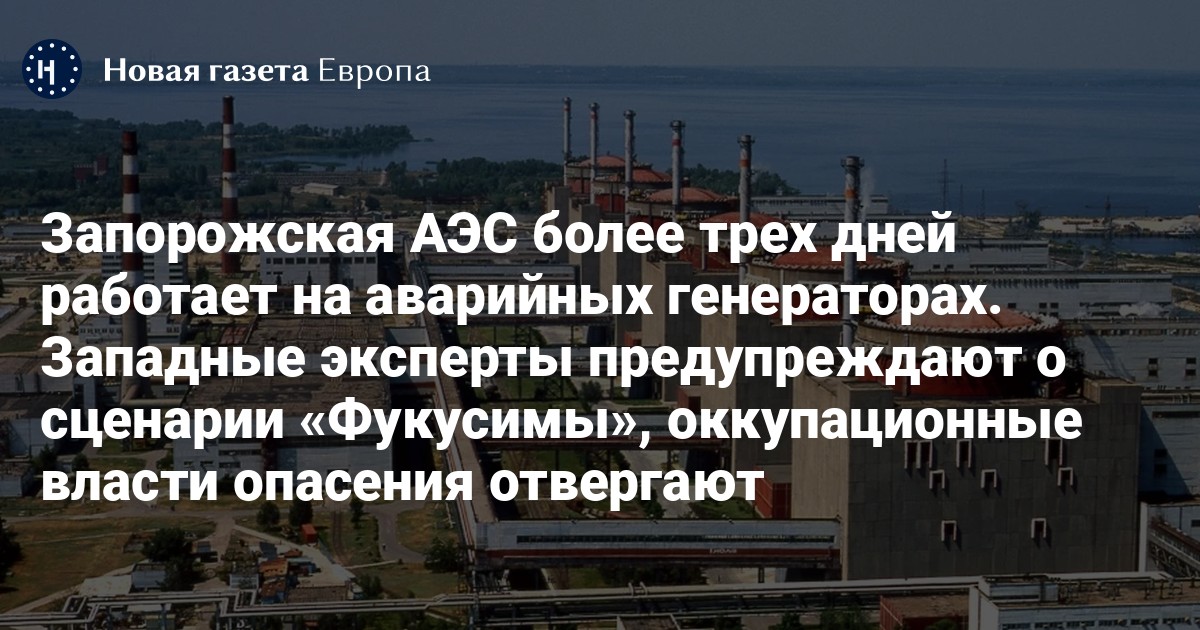 По данным издания, системы охлаждения и безопасности станции работают на дизельных генераторах из-за перекрытия последней линии электропередачи — что создает риск выхода из строя охладительных установок и может привести к неконтролируемому нагреванию и раслпавлению активной зоны реакторов в течение нескольких недель.