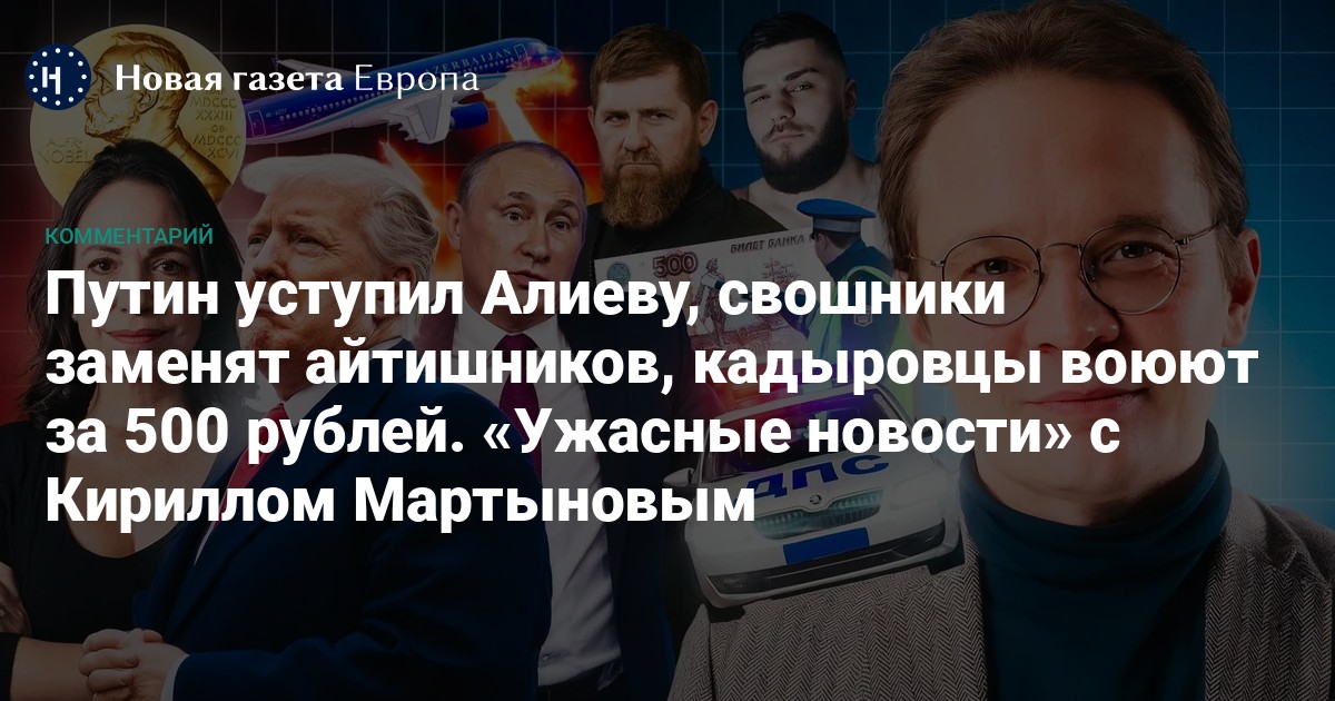 Трампу не дали нобелевку, премию получает венесуэльская оппозиционерка Мария Мачадо. Хрупкое перемирие в Газе, Путин косвенно признает сбитый азербайджанский самолет. Из-за ударов России Украина остается без света из тепла накануне зимы, ветераны СВО занимают место уехавших айтишников, растет число убийств среди военных и жертв авиакатастроф, идет охота на «тунеядцев», абсурдные запреты ВК, битва Эльбруса с «Грозный-Сити» за 500 рублей. Каждую субботу Кирилл Мартынов, главный редактор «Новой газеты Европа», комментирует самые важные новости, которые случились в России и мире за прошедшую неделю.
