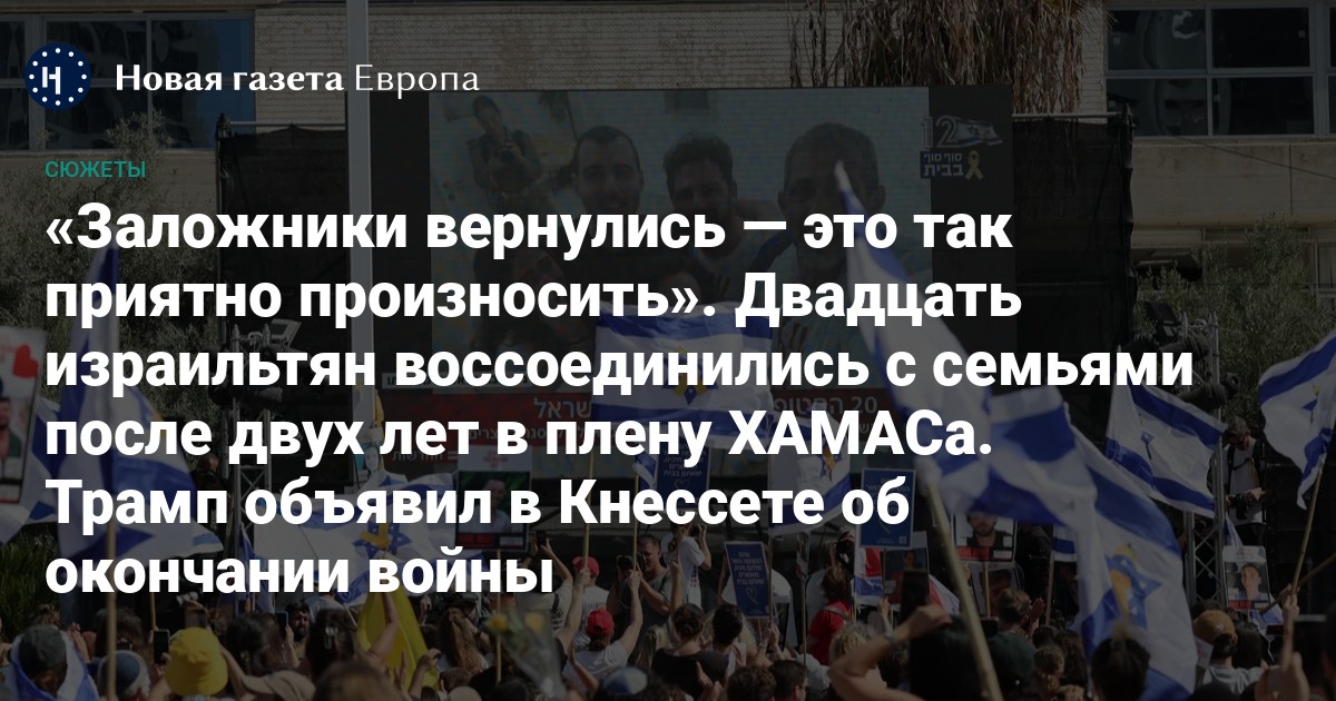 Сотни тысяч человек собрались в Тель-Авиве, чтобы вместе наблюдать за трансляцией возвращения израильтян. Тем временем президент США Дональд Трамп, благодаря которому стороны пришли к компромиссу, прилетел в Израиль и выступил в Кнессете (парламенте) в Иерусалиме. Он официально объявил об окончании войны в секторе Газа.