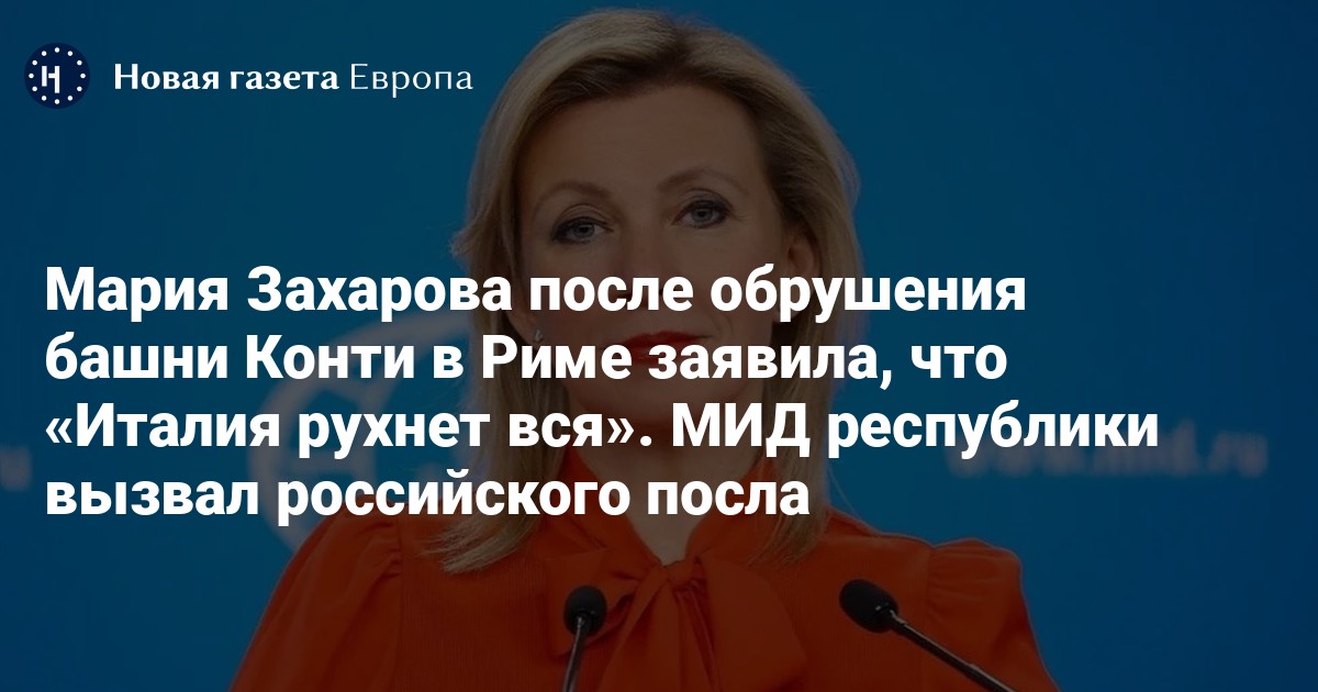 Министерство иностранных дел Италии вызвало российского посла после заявления представителя МИД РФ Марии Захаровой, прокомментировавшей обрушение башни Конти в Риме словами «Италия рухнет вся». Об этом пишет газета Il Fatto Quotidiano.