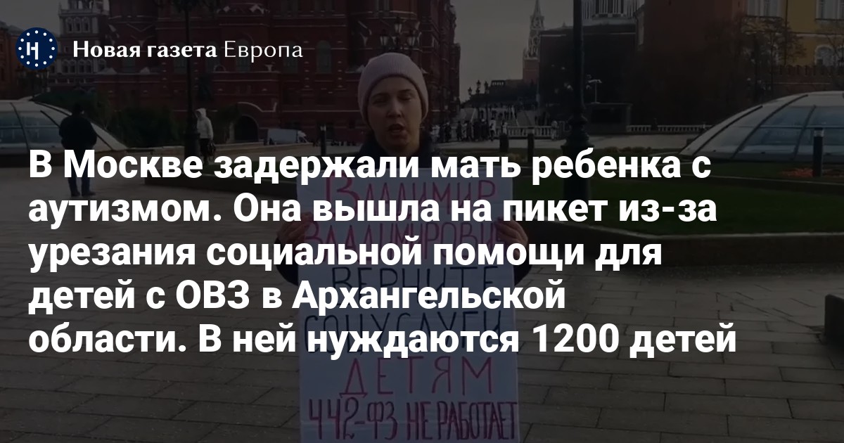 Черепанова обратилась к Владимиру Путину. Ее пикет был посвящен проблеме оказания социальных услуг детям с ограниченными возможностями здоровья. Жительницу Архангельской области доставили в отделение полиции Китай-город, а затем отпустили без протокола, сообщили «Новой-Европа» ее близкие.
