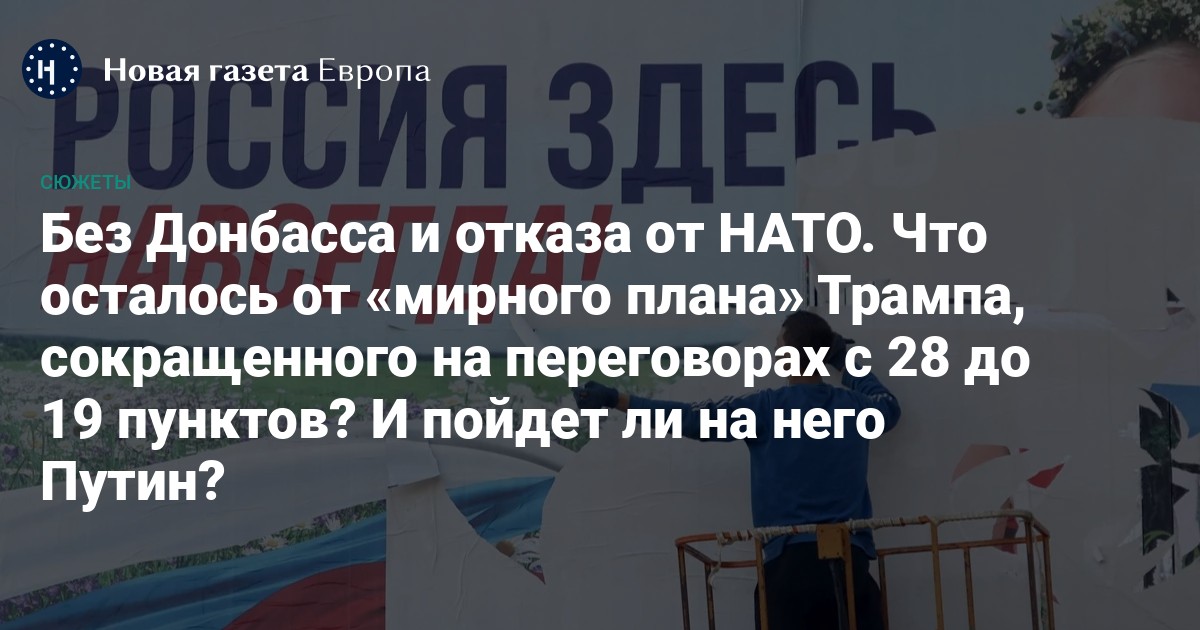 Во время переговоров в Женеве США и Украина изменили первоначальный «мирный план» Трампа, сократив его с 28 до 19 пунктов, и договорились вынести за скобки самые спорные пророссийские требования — отказ Киева от вступления в НАТО и территориальные уступки. Теперь эти пункты отложены для будущих обсуждений, и главный вопрос заключается в том, подпишется ли Владимир Путин под оставшимися.
