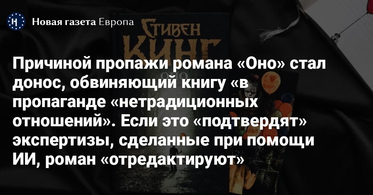 Кто написал донос — не сообщается. По ее словам, издательство также проведет собственную оценку книги с помощью искусственного интеллекта. По результатам экспертиз коллектив «примет решение о маркировке романа Кинга в соответствии с законодательством России», добавила Горская.