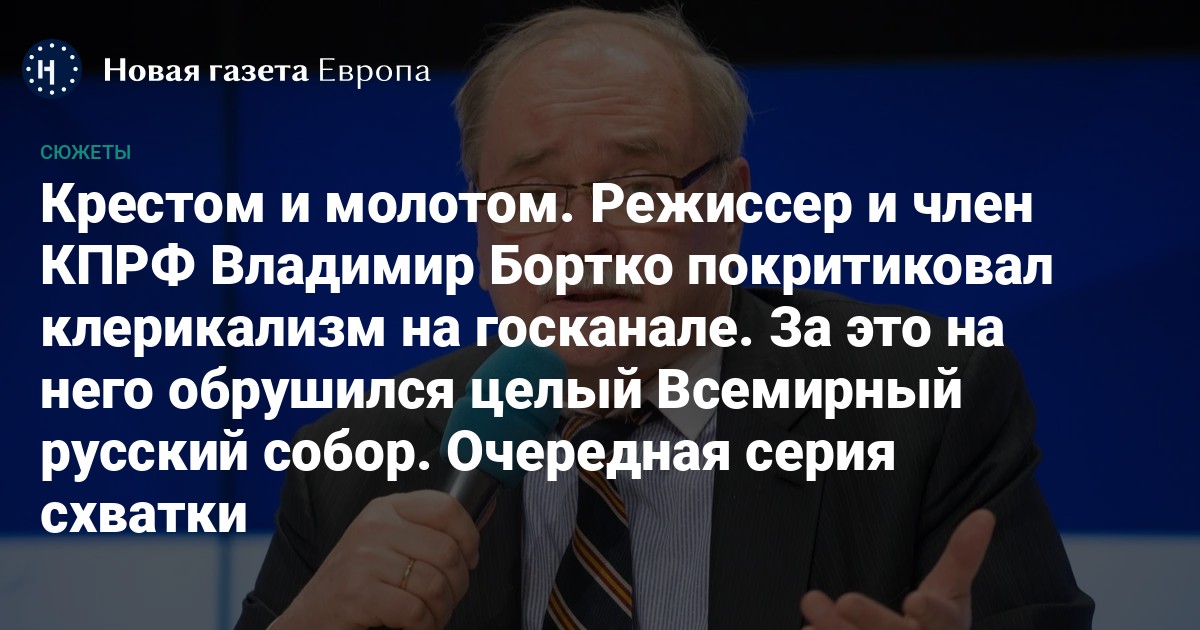 Начало нынешнего года отметилось новой стычкой на этом фронте. Целый Всемирный русский народный собор — по сути, главный общественно-политический орган РПЦ — выпустил заявление против кинорежиссера Владимира Бортко, известного по фильмам «Собачье сердце», «Идиот», «Тарас Бульба» и сериалам «Улицы разбитых фонарей» и «Бандитский Петербург», фактически призвав к репрессиям против него. Поводом стала авторская программа режиссера «Взгляд из Петербурга» на канале «Россия24». В предновогоднем выпуске