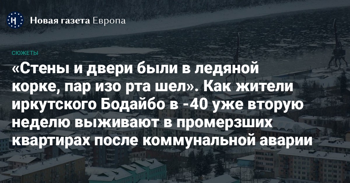 Жители Бодайбо уже 11-й день живут в холодных квартирах: температура дома около нуля, канализация замерзла, в городе ввели режим ЧС. Людей призывают по возможности уехать на время из промерзших домов. Всё это — последствия масштабной коммунальной аварии, которая произошла в городе в ночь на 30 января в 40-градусный мороз. В итоге 1,3 тысячи человек остались без тепла и воды.