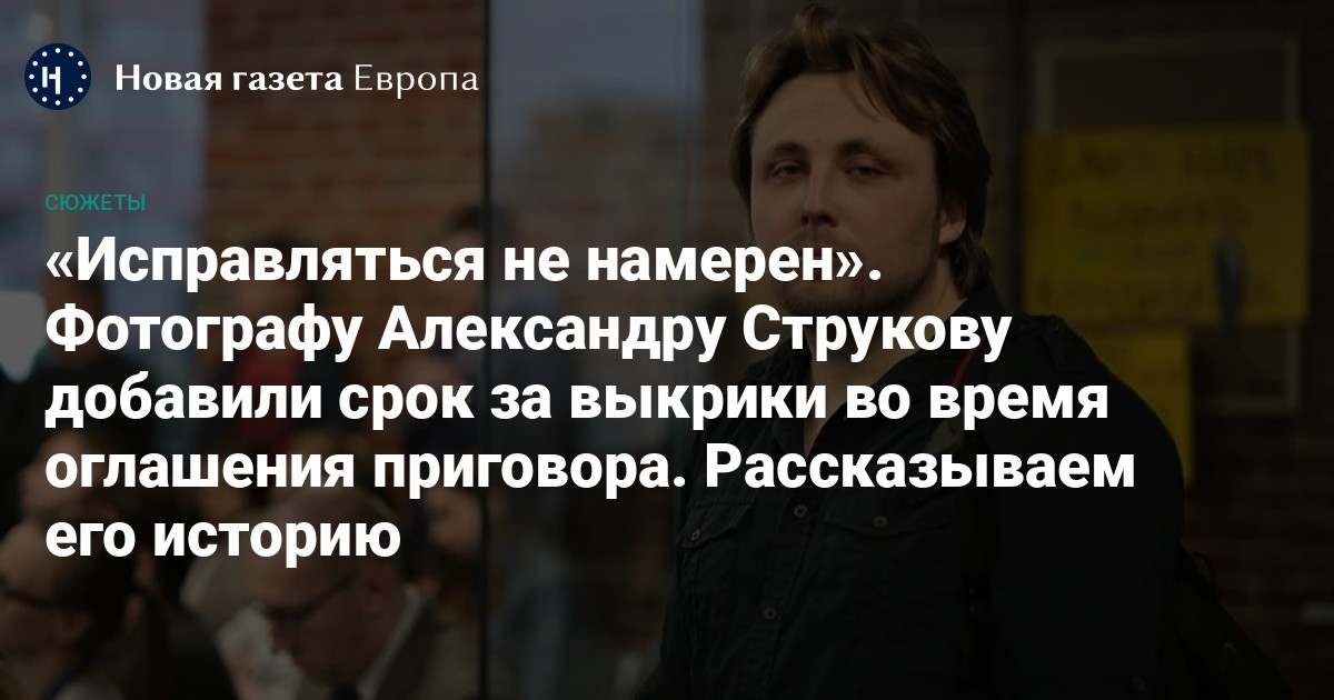 Александр Струков, 32-летний фотограф из Москвы, был волонтером штаба Алексея Навального и писал комментарии в телеграм-канале издания Znak. За эти комментарии его отправили в колонию. На оглашении приговора он пожелал Путину смерти, а Украине — славы.