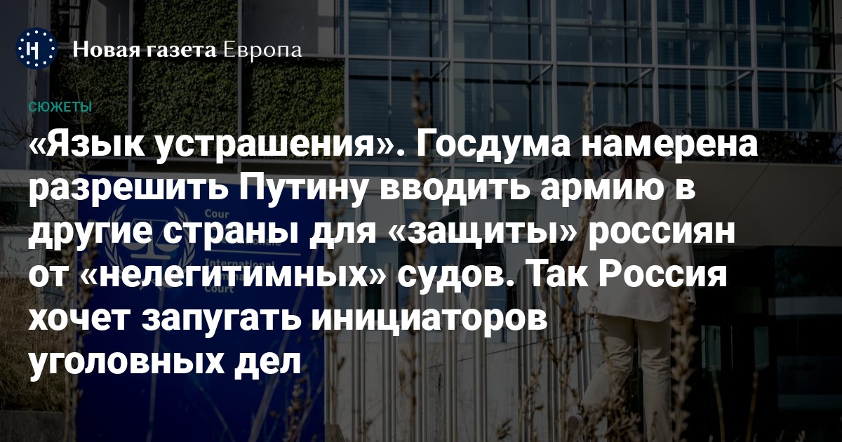 Однако эксперты, опрошенные «Новой-Европа», считают, что цель документа не правовая, а психологическая: запугать возможных инициаторов уголовных дел и дискредитировать саму идею международного правосудия. Юристы называют инициативу «информационным шумом» и напоминают: Россия и так использовала силу за рубежом без всяких законов.