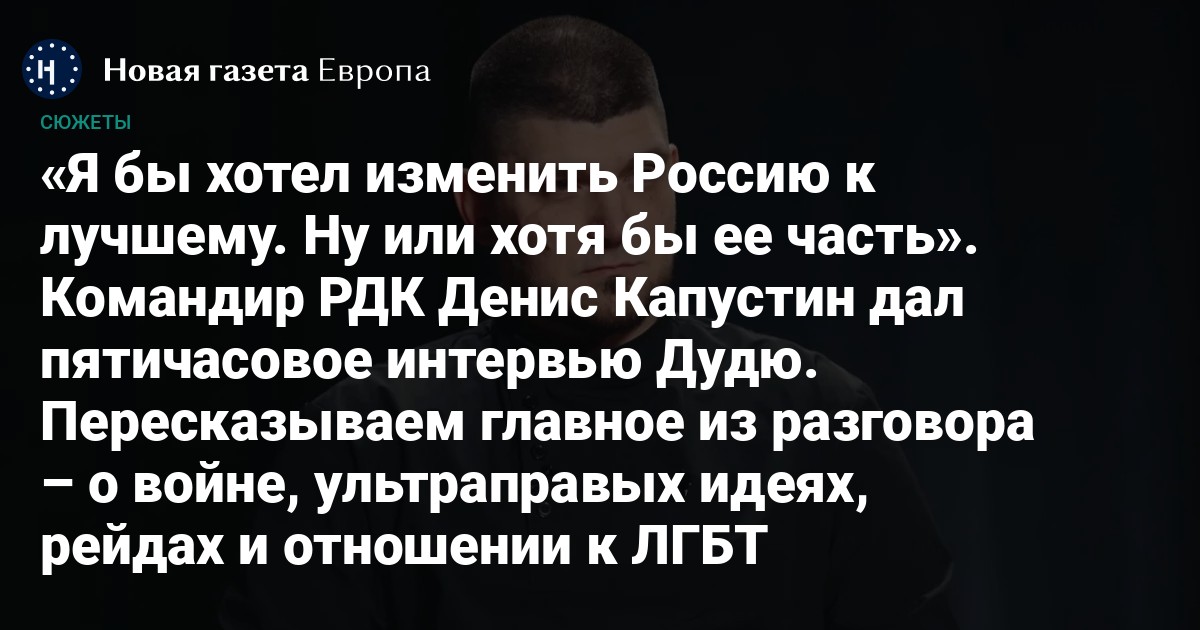 На канале Юрия Дудя вышло интервью (оно идет 4 часа 42 минуты) с Денисом (White Rex) Капустиным — командиром и основателем «Русского добровольческого корпуса» (РДК), формирования россиян, воюющих на стороне Украины.
