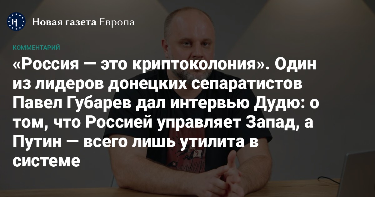 На уточняющий вопрос Дудя, считает ли он Путина «настолько бесхребетным, беспомощным, не влияющим ни на что», Губарев отвечает: «Ну, он человек такой. Он же это царство не завоевал в кровавой борьбе. Его случайно вынесло. Мы определили, что в системе этой Путин — это небольшая утилита. Оператор всё равно находится извне, а эта утилита, она не управляющая».